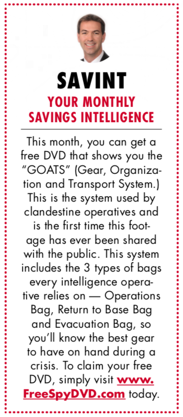 Many of you have reached out to me in the past few months to acquire physical gold and silver inside and outside of your IRAs. I’ve been amazed at the number of existing clients from Universal Coin and Bullion that have called to let me know that they enjoy reading my articles in the Spy & Survival Briefing and have been wanting to invest in gold and silver, but don’t know where to start. If you are like them and are looking to pick up a little bit of survival protection for a worst-case scenario, then call me and I will help you to acquire some of my top recommendations: 1-ounce Silver American Eagles and 1/10 ounce Gold American Eagles.